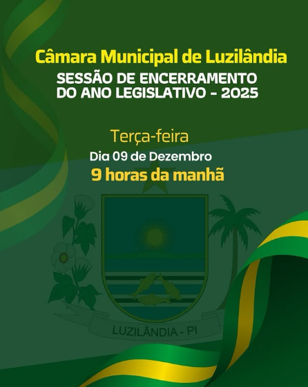 A Câmara Municipal de Luzilândia informa que será realizada a Sessão de Encerramento do Ano Legislativo de 2025 no dia 09 de dezembro, terça-feira, com início às 9h.